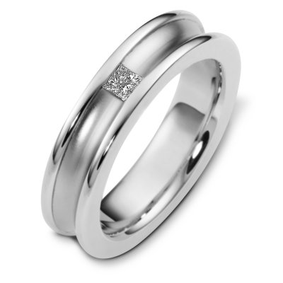 18 K white gold, 6.0 mm wide, comfort fit diamond wedding band. The princess cut diamond weighs 0.16 ct and is graded as VS1 in clarity G in color. The curved inward portion of the ring is a matte finish. The outer edges are polished. Other finishes may be selected or requested.