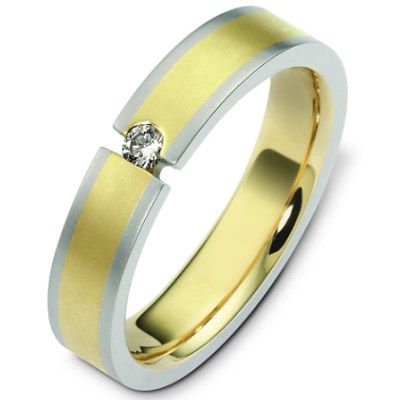 Platinum and 18K yellow gold, 5.0 mm wide, comfort fit, diamond wedding band. Diamond is 0.09 ct and VS in clarity G-H in color. The finish on the ring is matte. Other finishes may be selected or requested.