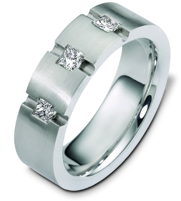 14K white gold, comfort, fit, 7.0 mm wide, diamond wedding bands. The band has three princess cut diamonds each weighs 0.16 ct together diamonds total weight is 0.48ct. Diamonds are graded as VS1 in clarity G in color. The finish on the ring is matte. Other finishes may be selected or requested.