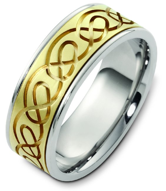 18K Gold and Platinum, comfort fit, 8.0 mm wide Celtic wedding band. The center of the ring is matte and the outer edges are polished. Different finishes may be selected or specified.
