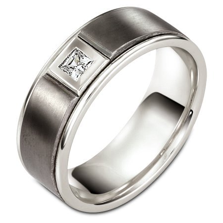 Titanium and Platinum diamond wedding band, 8.0 mm wide, comfort fit band. It holds one 0.16 ct diamond, VS in clarity and GH in color. The titanium portion is matte and the rest of the ring is polished. Different finishes may be selected or specified.