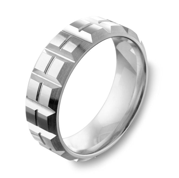 Cobalt chrome contemporary, 7.0 mm wide wedding ring. The ring has beveled edges that are brushed finish. The top of the ring is all polished. Other finishes may be selected.