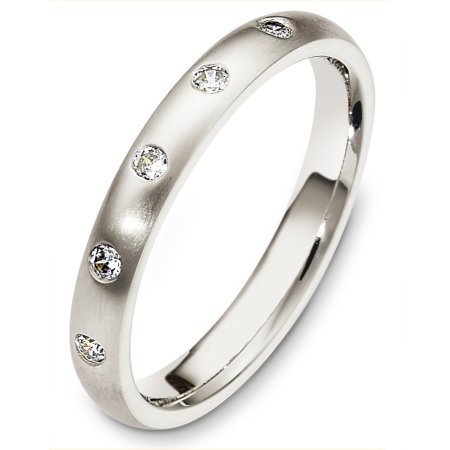 14 Kt White gold diamond wedding band, 3.0 mm wide, comfort fit band. It holds 0.13 ct tw diamonds, VS in clarity and GH in color. The finish on the rings is matte. Other finishes may be selected or specified.