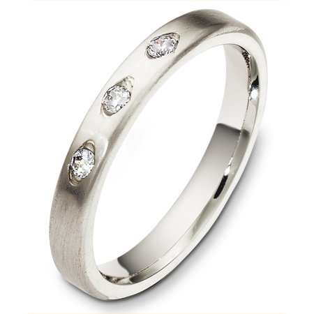 Platinum diamond wedding band, 3.0 mm wide, comfort fit band. It holds 3 diamonds that are 0.12 ct tw, VS in clarity and GH in color. The finish is brushed. Other finishes may be selected or specified.
