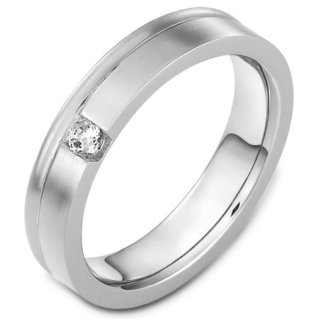 18 Kt White gold diamond wedding band, 5.0 mm wide, comfort fit band. The band holds one stone that weighs 0.10 ct diamond, VS in clarity and GH in color. The finish on the ring is matte. Other finishes may be selected or specified.