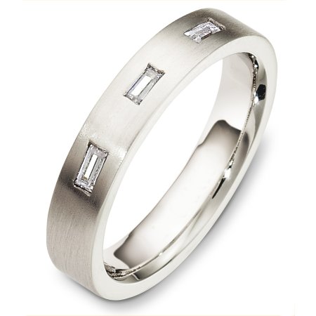 Platinum diamond wedding band, 4.0 mm wide, comfort fit band. It holds 0.18 ct tw baguette diamonds, VS in clarity and GH in color. The finish on the ring is matte. Other finishes may be selected or specified.
