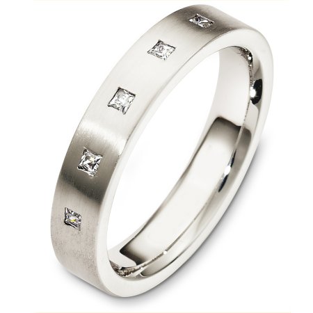 Platinum diamond wedding band, 4.0 mm wide, comfort fit band. It holds 0.10 ct tw princess cut diamonds, VS in clarity and GH in color. The finish on the ring is matte. Other finishes may be selected or specified.