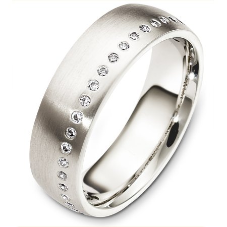 14 Kt White gold diamond eternity wedding band, 6.0 mm wide, comfort fit band. It holds 23 diamonds of 0.23 ct tw, VS in clarity and GH in color. The finish is matte. Other finishes may be selected or specified.