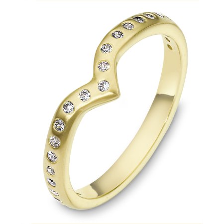 14 Kt Yellow gold diamond wedding band, 2.5 mm wide, comfort fit band. It holds 0.25 ct tw diamonds, VS in clarity and GH in color. The finish is matte. Other finishes may be selected or specified.