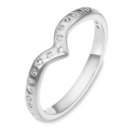 18 Kt White gold diamond wedding band, 2.5 mm wide, comfort fit band. It holds 0.25 ct tw diamonds, VS in clarity and GH in color. The finish is matte. Other finishes may be selected or specified.