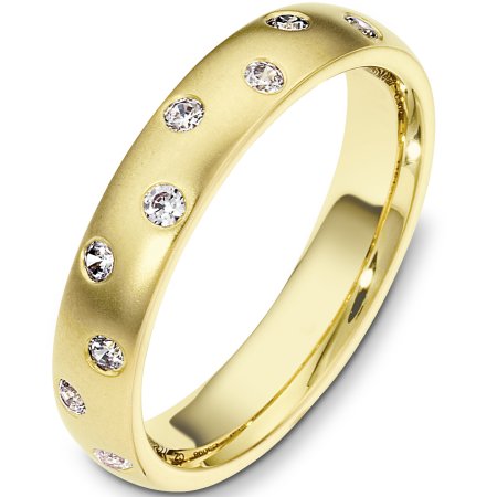 18 Kt Yellow gold diamond wedding band, 4.0 mm wide, comfort fit band with 9 diamonds total weight of 0.23 ct tw, VS1-2 in clarity and GH in color. The finish is matte. Other finishes may be selected or specified.
