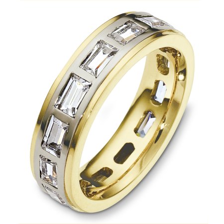 18 Kt Two-tone diamond eternity wedding band, 5.5 mm wide, comfort fit band. It holds approximately 2.80 ct tw diamonds, VS in clarity and GH in color. The finish on the ring is polished. Other finishes may be selected or specified.