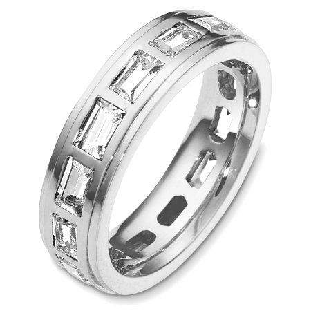 14 Kt White gold diamond eternity wedding band, 5.5 mm wide, comfort fit band. It holds 2.80 ct tw diamonds, VS in clarity and GH in color. The finish on the ring is polished. Other finishes may be selected or specified.