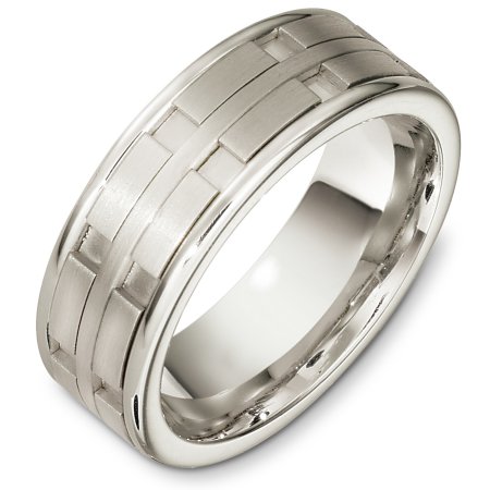 Platinum wedding band, 8.0 mm wide, comfort fit wedding band. The center of the band is matte and the outer edges are polished. Other finishes may be selected or specified.
