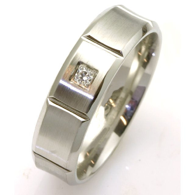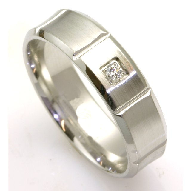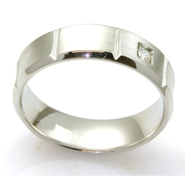 Cobalt chrome diamond, 7.0 mm wide wedding ring. The ring holds one round brilliant cut diamond that is 0.05 carats. The diamonds are VS1-2 in clarity and G-H in color. The ring is brushed in the center and polished on the beveled edges. Other finishes may be selected.