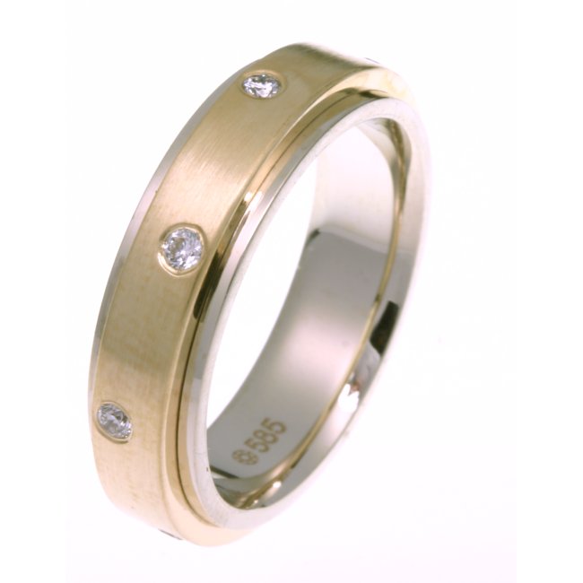 18 K two-tone center rotating, 6.0 mm wide diamond spinning wedding band. Diamond total weight is 0.24 ct in size six. Diamonds are graded as VS in clarity H in color. The finish in the center of the ring is matte and the outer edges are polished. Other finishes may be selected or specified.