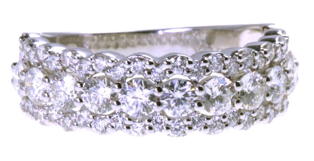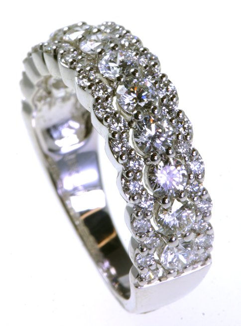 One platinum diamond anniversary band holds 57 round brilliant cut diamonds with total weigh of 1.47ct. The diamonds are graded as VS in clarity G-H in color.
