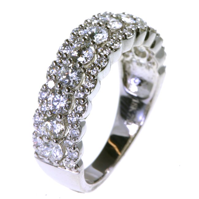 One platinum diamond anniversary band holds 57 round brilliant cut diamonds with total weigh of 1.47ct. The diamonds are graded as VS in clarity G-H in color.