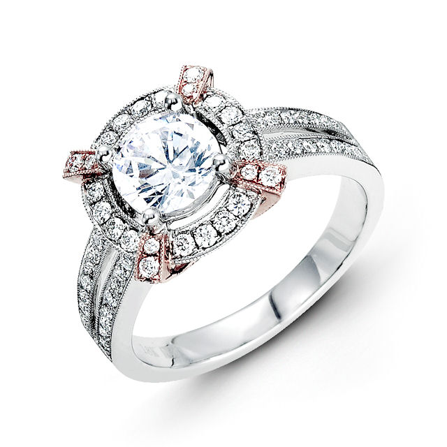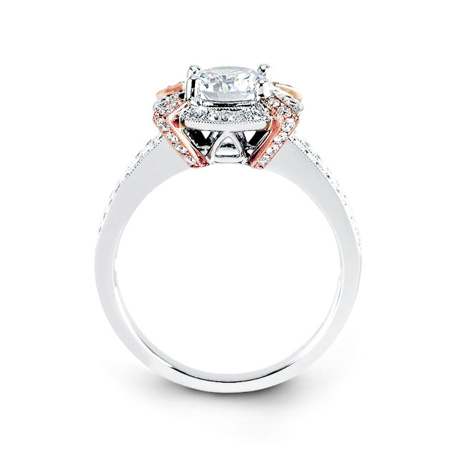 14kt rose & white gold, halo, vintage diamond engagement ring. There are about 72 round brilliant cut diamonds set in the ring. The diamonds are about 0.54 ct tw, VS1-2 in clarity and G-H in color. Center stone is sold separately and in different sizes. Pictured is a 1.0 carat diamond.