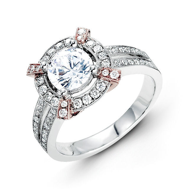 18kt rose & white gold, halo, vintage diamond engagement ring. There are about 72 round brilliant cut diamonds set in the ring. The diamonds are about 0.54 ct tw, VS1-2 in clarity and G-H in color. Center stone is sold separately and in different sizes. Pictured is a 1.0 carat diamond.