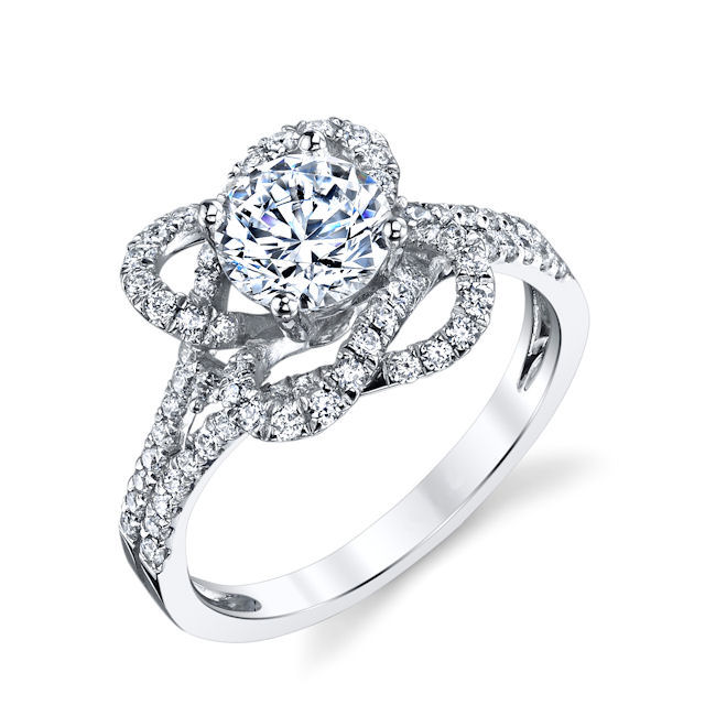 Platinum, modern, diamond engagement ring. There are about 78 round brilliant cut diamonds set in the ring. The diamonds are about 0.56 ct tw, VS1-2 in clarity and G-H in color. Center stone is sold separately and in different sizes. Pictured is a 1.0 carat diamond.