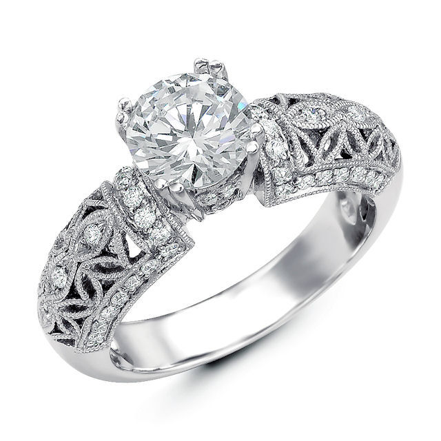18kt white gold, vintage, diamond engagement ring. There are about 48 round brilliant cut diamonds set in the ring. The diamonds are about 0.33 ct tw, VS1-2 in clarity and G-H in color. Center stone is sold separately and in different sizes. Pictured is a 1.0 carat round diamond.