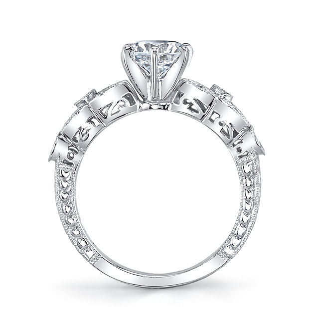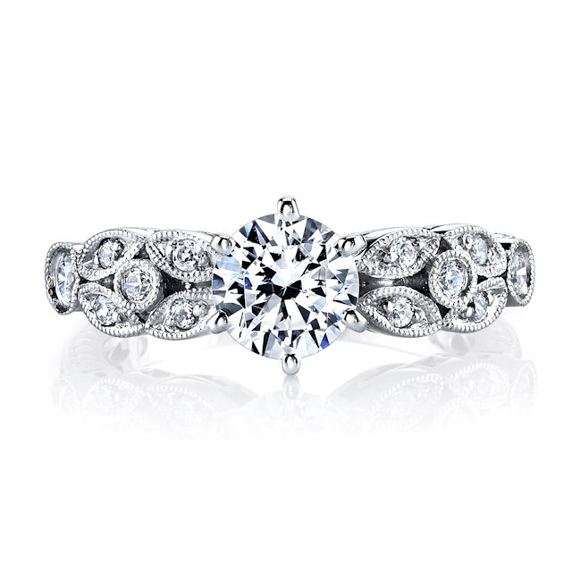 18kt white gold, vintage with a modern twist, diamond engagement ring. There are about 12 round brilliant cut diamonds set in the ring. The diamonds are about 0.21 ct tw, VS1-2 in clarity and G-H in color. Center stone is sold separately and in different sizes. Pictured is a 1.0 carat diamond.