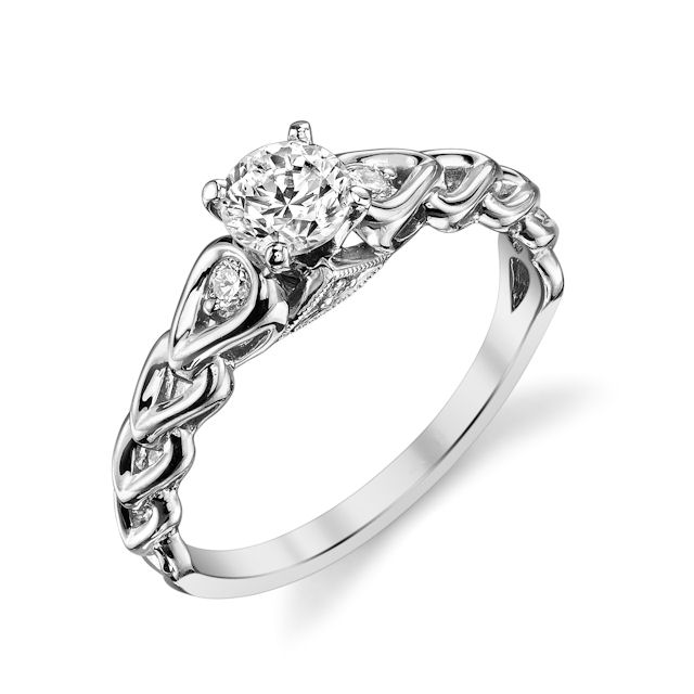 14kt white gold, sculptural diamond engagement ring. There are about 4 round brilliant cut diamonds set in the ring. The diamonds are about 0.09 ct tw, VS1-2 in clarity and G-H in color. Center stone sold separately and in different sizes. Pictured is 0.75 carat diamond.