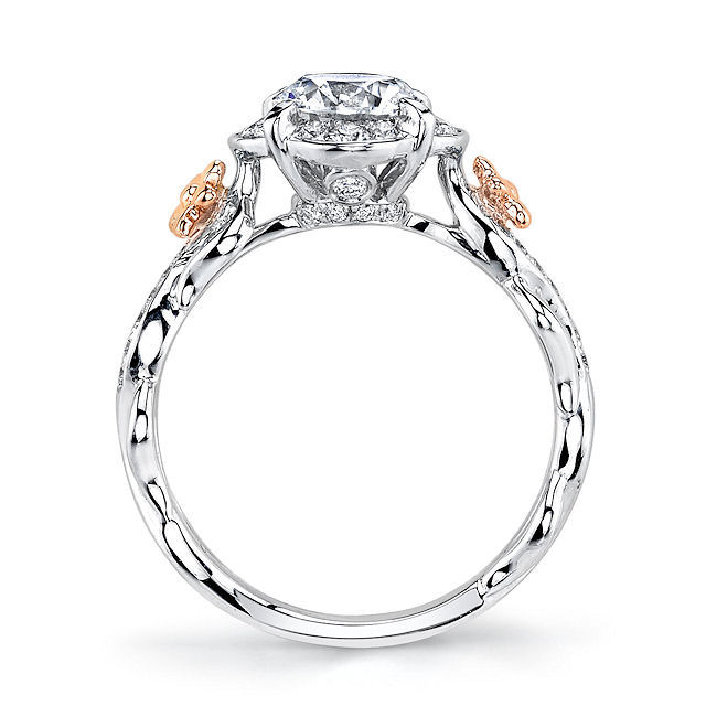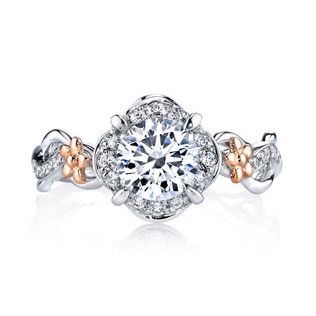 18kt white & rose gold, floral design, diamond halo engagement ring. There are 34 round brilliant cut diamonds set in around the center stone and the sides of the ring. The diamonds are about 0.26 carats total weight, VS1-2 in clarity and G-H in color. Center stone is sold separately and in other sizes. Pictured here is about a 1.0 carat diamond.