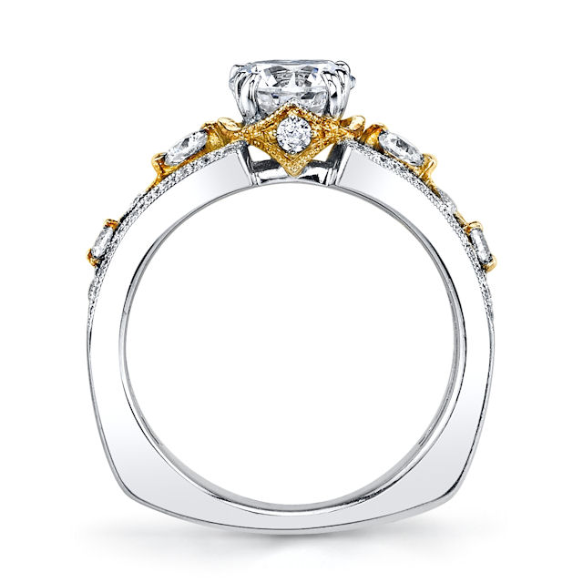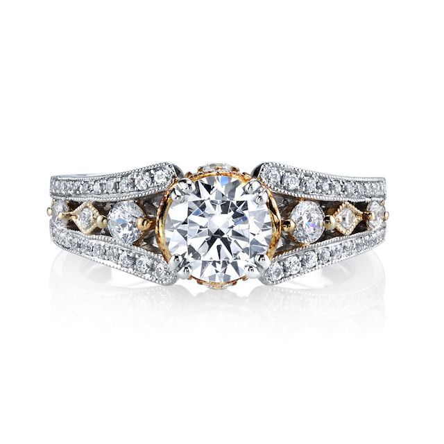 18kt two-tone, milgrain, diamond engagement ring. There are about 54 round brilliant cut diamonds set in the ring. The diamonds are about 0.46 ct tw, VS1-2 in clarity and G-H in color. Center stone is sold separately and in different sizes. Pictured is a 1.0 carat diamond.