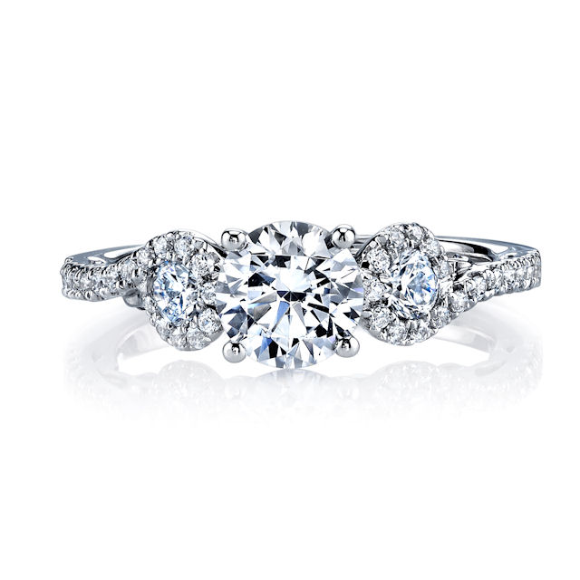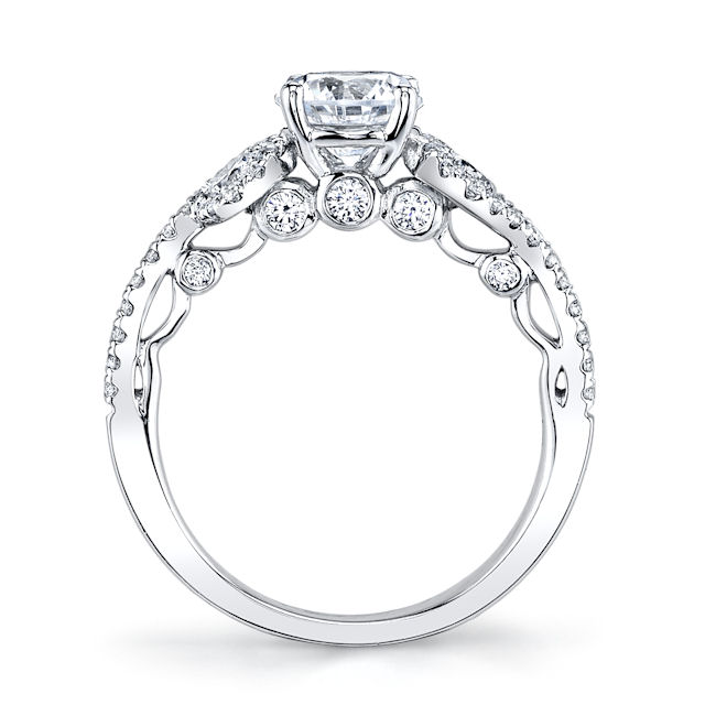 18kt white gold, diamond, sculptural engagement ring. There are about 46 round brilliant cut diamonds set in the ring. The diamonds are about 0.63 ct tw, VS1-2 in clarity and G-H in color. Center stone is sold separately and in different sizes. Picutred is a 1.0 carat diamond.