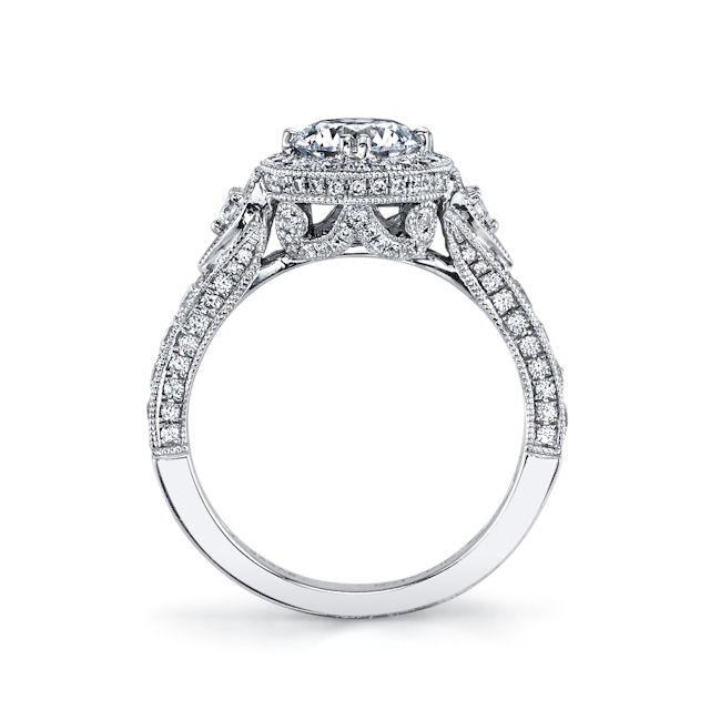 14kt white gold, vintage, diamond halo engagement ring. There are about 122 round brilliant cut diamonds set in the ring. The diamonds are about 1.35 ct tw, VS1-2 in clarity and G-H in color. Center stone is sold separately and in different sizes. Pictured is a 1.0 carat diamond.