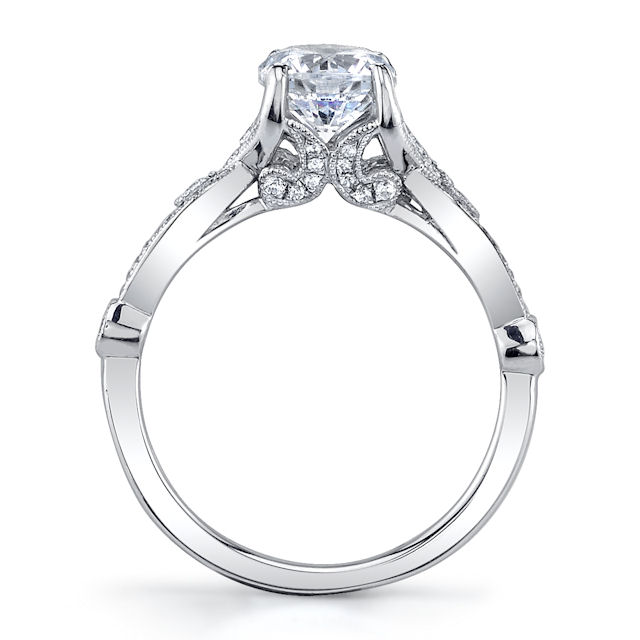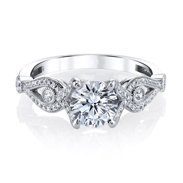 14kt white gold, sculptural, diamond engagement ring. There are about 75 round brilliant cut diamonds set in the ring. The diamonds are about 0.21 ct tw, VS1-2 in clarity and G-H in color. Center stone is sold separately and for any size. Pictured is a 1.0 carat diamond.