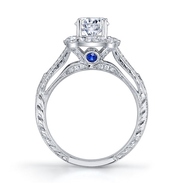 18kt white gold, vintage, halo diamond engagement ring. There are about 82 round brilliant cut diamonds set in the ring with 2 round brilliant cut genuine sapphires on the sides. The diamonds are about 0.51 ct tw, VS1-2 in clarity and G-H in color with 0.10 ct tw genuine sapphire. Center stone is sold separately and in different sizes. Pictured here is a 1.25 carat diamond.