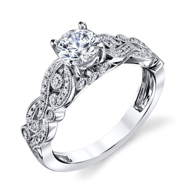 Platinum, modern, diamond engagement ring. There are about 62 round brilliant cut diamonds set in the ring. The diamonds are about 0.25 ct tw, VS1-2 in clarity and G-H in color. Center stone is sold separately and in different sizes. Pictured is a 0.75 carat diamond.