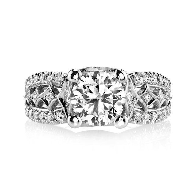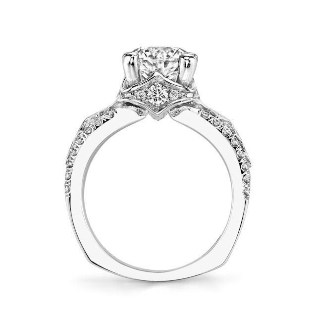 18kt white gold, diamond engagement ring. There are about 48 round brilliant cut diamonds set in the ring. The diamonds are about 0.70 ct tw, VS1-2 in clarity and G-H in color. Center stone is sold separately and in different sizes. Pictured is a 1.50 carat diamond.