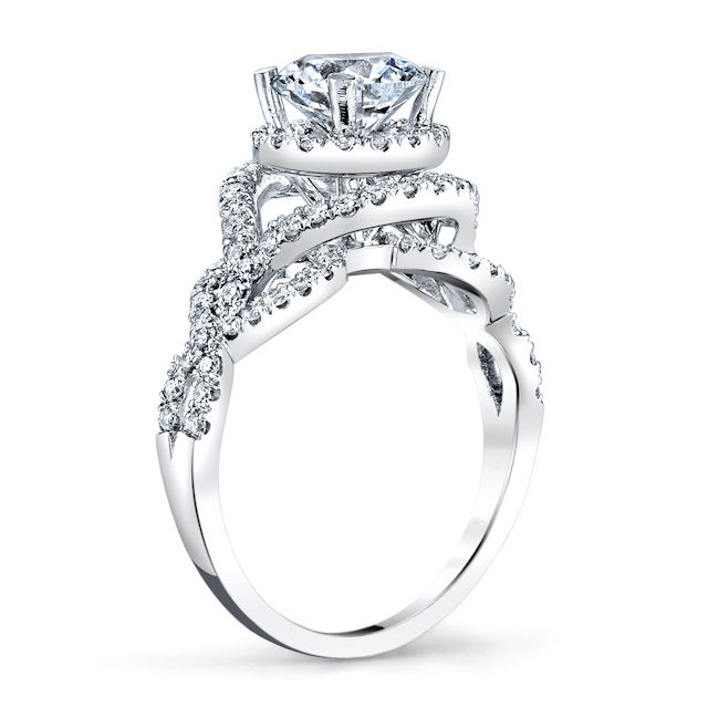 Platinum, diamond, scupltural, halo engagement ring. There are about 90 round brilliant cut diamonds set in the ring. The diamonds are about 0.55 ct tw, VS1-2 in clarity and G-H in color. Center stone is sold separately and in different sizes. Pictured is a 1.0 carat diamond.