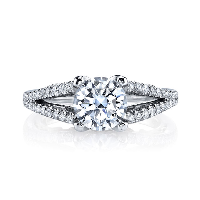 14kt rose & white gold, diamond engagement ring. There are about 48 round brilliant cut diamonds set in the ring. The diamonds are about 0.35 ct tw, VS1-2 in clarity and G-H in color. Center stone is sold separately and in different sizes. Pictured is a 1.50 carat diamond.