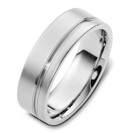 18 K white gold, comfort fit, 7.0 mm wide wedding band. The finish on the ring is matte and the stripe is polished. Other finishes may be selected or specified.