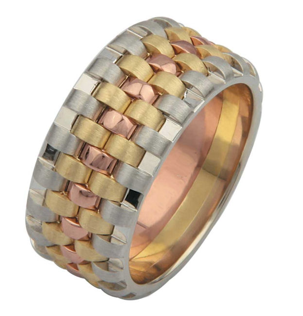 One 18 kt tricolor gold, comfort fit, 9.25 mm wide unique wedding band. Please allow us 3 weeks to manufacture this ring. Color combination can be made to you specification.