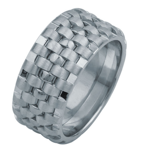 One 18kt white gold, comfort fit, 9.25 mm wide unique wedding band. Please allow us 3 weeks to manufacture this wedding band.
