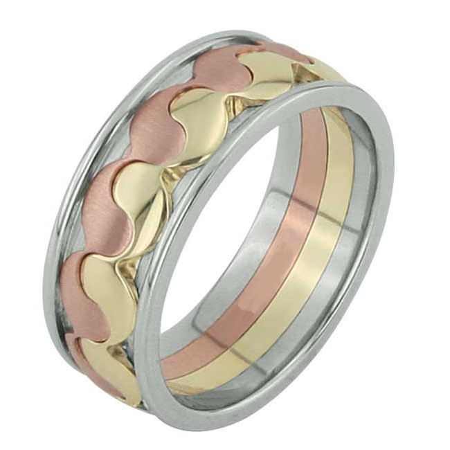 One 14 kt tri-color gold, comfort fit wedding band. the band weighs 12.0 gr. This wedding ring is a symbol of balance and eternal stability. Please allow us 3 weeks to manufacture the wedding ring