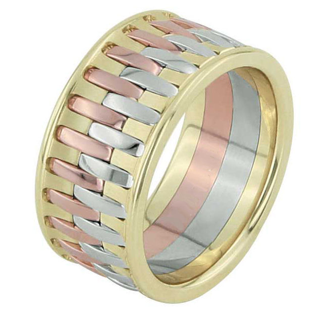 One 14 kt tri color gold, comfort fit, 10.90mm wide wedding band. Please allow us 3 weeks to manufacture the wedding ring.