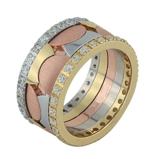 One 18 kt tri color gold, comfort fit, eternity ring. This wedding band holds 1.05 ct total weight diamonds in size 6.0 the diamonds are graded as VS1-2 in clarity G-H in color. Please allow us 3 weeks to manufacture the wedding ring