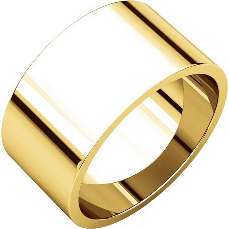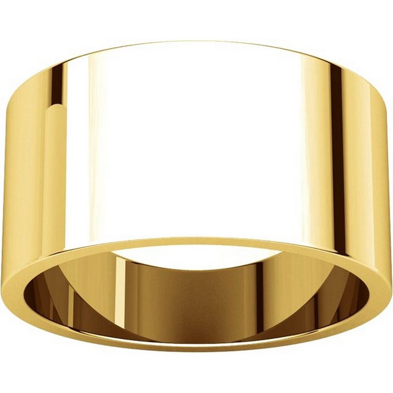 18 kt yellow gold, 10.0 mm wide, flat, plain wedding band. The finish on the ring is polished. Other finishes may be selected or specified.