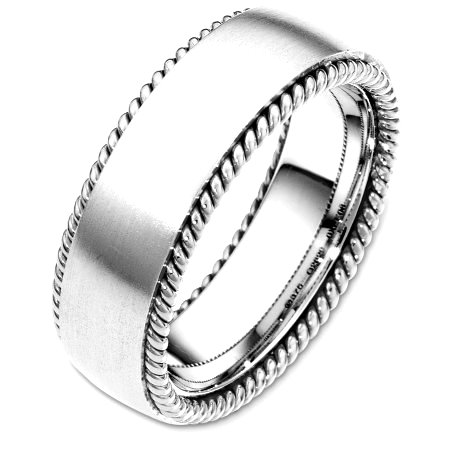 Palladium, 7.5 mm wide, comfort fit wedding band. The ring has two hand made ropes on each side of the band. The center of the ring is matte and the ropes are polished. Other finishes may be selected or specified.