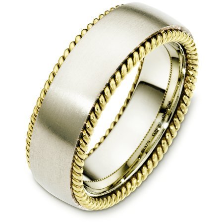 Platinum and 18 Kt Yellow gold wedding band, 7.5 mm wide, comfort fit wedding band. The ring has two hand made ropes on each side of the band. The center of the ring is matte and the ropes are polished. Other finishes may be selected or specified.