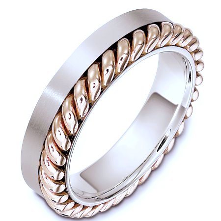 Platinum and 18 Kt Rose gold wedding band, 5.5 mm wide, comfort fit wedding band. There is one hand made rope on one side of the ring. The finish on the rope is polished and the rest of the band is matte. Other finishes may be selected or specified.