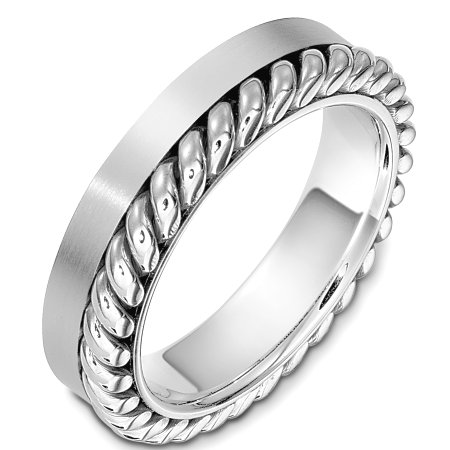 14 Kt White gold wedding band, 5.5 mm wide comfort fit wedding band. There is one hand made rope on one side of the ring. The finish on the rope is polished and the rest of the band is matte. Other finishes may be selected or specified.