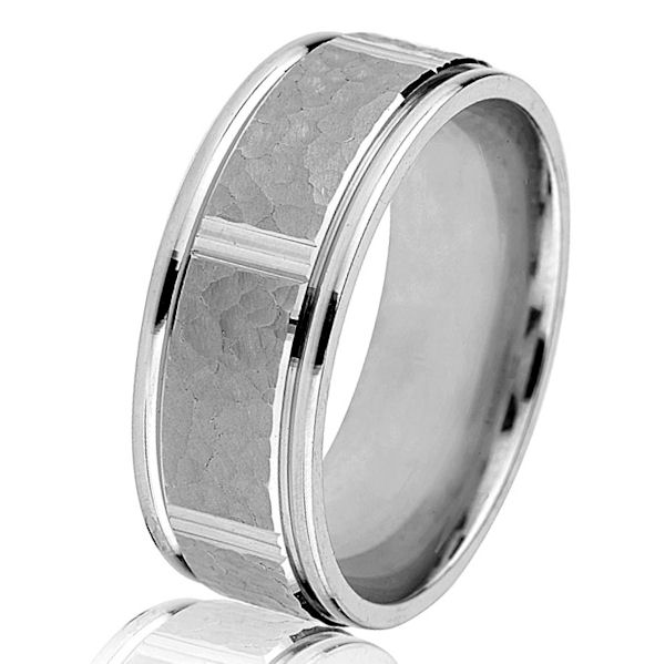 18kt white gold, classic, 8mm wide, comfort fit wedding ring. The center of the ring has a hammered and matte finish with polished edges. The ring is 8.0 mm wide. Other finishes may be selected or specified.